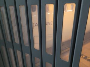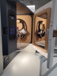 C’est une cabine que je connais bien pour l’avoir prise à plusieurs reprises. Un espace de rangement, le casque anti-bruit