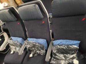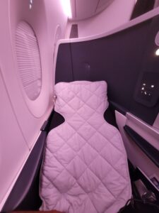 Bien installé. Siège couloir de la rangée du milieu. C’est le plus pratique sur des vols aussi longs et en plus de nuit. Cela évite d’être trop dérangé par ses voisins s’ils veulent aller aux toilettes.